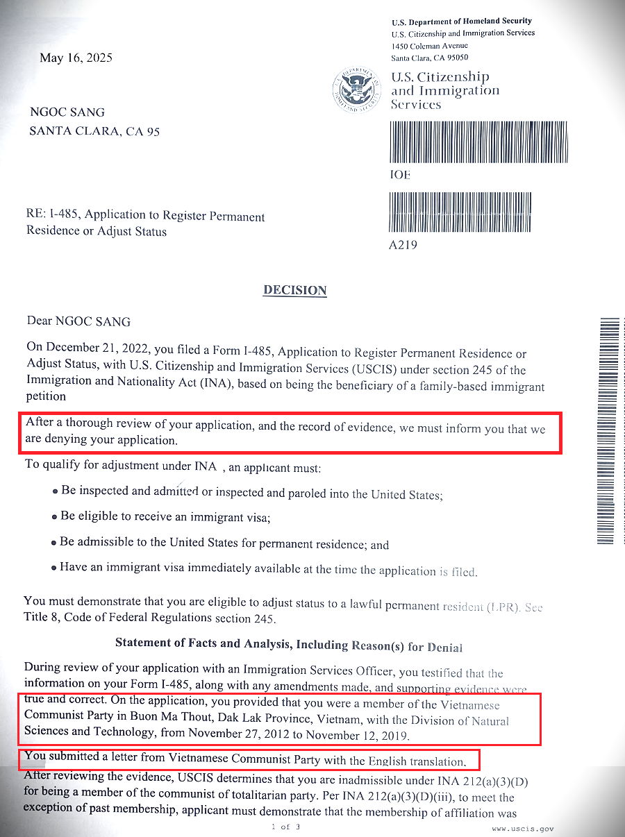 Hình 4. Ts.Putra Podam, nhận thư từ chối từ phía Sở Di trú Hoa Kỳ (Decision deny) được ghi 19/12/2022 (May 16, 2025). Lý do: "You provided that you were a member of the Vietnamese Communist Party in Buon Ma Thuot, Daklak, Vietnam". dịch là: "Ông đã cung cấp hồ sơ là thành viên Đảng CS Việt Nam tại Tp.Buôn Ma Thuột, tỉnh Daklak, Việt Nam". Nguồn: Putra Podam.