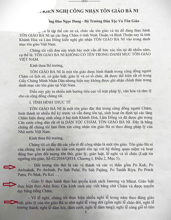 Hình 3. Bản kiến nghị ghi tên: Thông Minh Chánh, đề nghị Chính phủ nước Cộng hòa Xã hội Chủ nghĩa Việt Nam phải công nhận tôn giáo "Bani", một tôn giáo do tổ tiên người Cham (Chàm, Chăm) đã tạo lập từ thời ăn lông ở lổ và truyền lại cho hậu thế.
