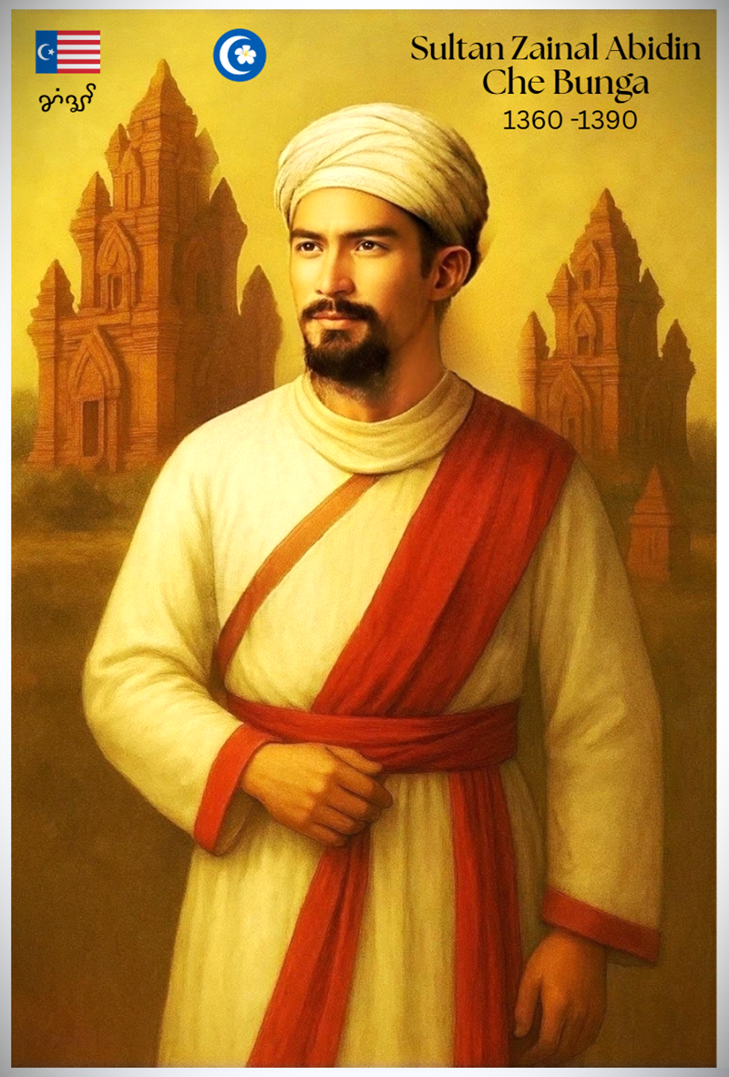 Hình 11. Che Bunga (1360-1390) là vị vua Hồi giáo (Islam). Khi lên ngôi vua Chế Bồng Nga lấy niên hiệu là: Sultan Zainal Abidin và cưới công chúa Siti Zubaidah Kelantan-Malaysia. Theo cách gọi của tộc người Rhade và Jarai tại vùng Vijaya-Degar (Champa thượng) là R'čam B'nga hay R'cam Bunga [Jaya R'cam Bunga] (Anak Campa Bunga). Ảnh: Putra Podam.