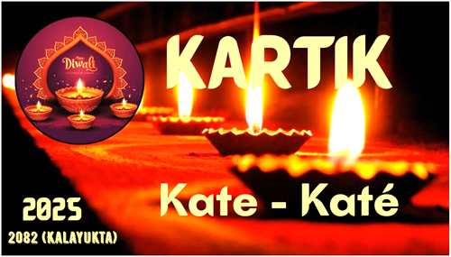 Hình 7. Tháng Kartik năm 2082 (Kalayukta) thuộc năm 2025 (Tây lịch), lễ Diwwali được tổ chức vào thứ Ba, ngày 21/10/2025, nhằm ngày mùng 01/07 Cham lịch. Kate (Karti, Kartik, Kartika: phiên âm từ tiếng Hindi thuộc Hindu Ấn giáo).