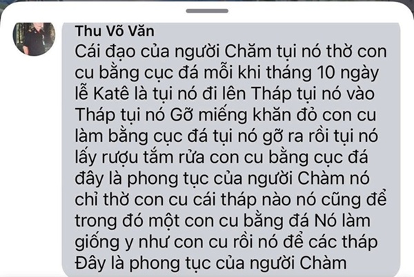 Thế nhưng, cùng thời điểm đó, một vụ việc khác lại khiến cộng đồng người Chăm trong và ngoài nước phẫn nộ: tài khoản Facebook “Võ Văn Thu” đăng tải nhiều bài viết, hình ảnh, lời lẽ xúc phạm nghiêm trọng đến tín ngưỡng, phong tục và lễ hội truyền thống của người Chăm, đặc biệt là lễ hội Katê – một di sản văn hóa phi vật thể cấp quốc gia, biểu tượng tinh thần của cả cộng đồng Chăm.