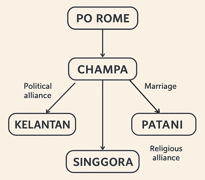 Hình 3. Sơ đồ Po Rome liên minh các trung tâm như Champa, Kelantan, Patani, hay Singgora, giúp Po Rome duy trì bền vững, tạo ra một hệ thống quan hệ vượt ra ngoài biên giới Champa, đồng thời củng cố vai trò của dòng tộc trong mạng lưới chính trị, tôn giáo khu vực. Ảnh: Putra Podam. “Figure 3. Diagram of Po Rome forming alliances with centers such as Champa, Kelantan, Patani, and Singgora, enabling him to maintain long-term stability and establish a network of relations extending beyond the borders of Champa, while simultaneously strengthening the role of his lineage within the regional political and religious network. Photo: Putra Podam”.