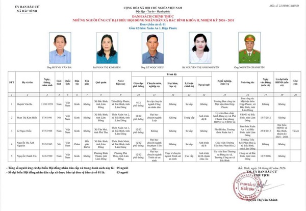 Hình 1. Danh sách trích ngang ứng cử Đại biểu Hội đồng nhân dân xã Bắc Bình khóa III, nhiệm kỳ 2026-2031, đơn vị bầu cử số: 02, thôn Xuân An & Hiệp Phú.