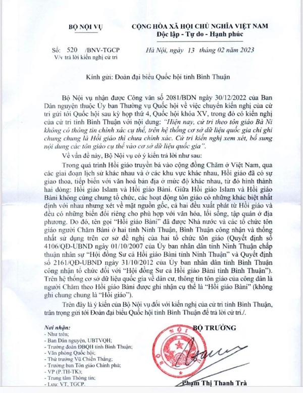 Sau khi tiếp nhận phản ánh về việc một số địa phương ghi mục tôn giáo trong lý lịch trích ngang chưa đúng, chưa thống nhất theo Danh mục tôn giáo Việt Nam ban hành kèm Công văn số 6952/BNV-BTGCP ngày 28/12/2020 của Bộ Nội vụ Việt Nam, các cơ quan chức năng đã khẩn trương kiểm tra, rà soát và triển khai các biện pháp chấn chỉnh, bảo đảm thống nhất ghi đúng tên gọi “Hồi giáo Bani” theo quy định.