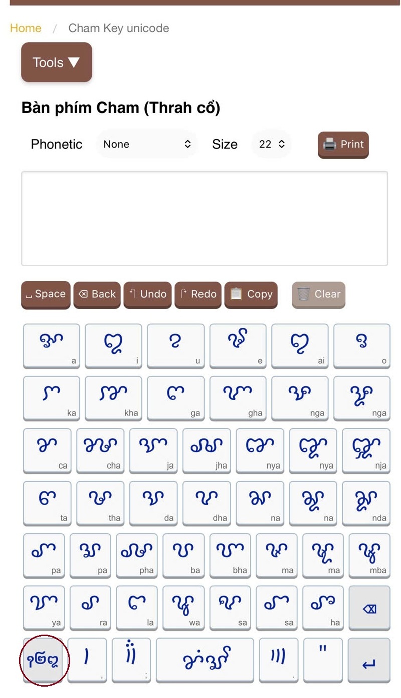 Hình 14. Bàn phím Cham (phần dấu Thrah). Nút khoanh tròn: ꨀ: chuyển qua phần chữ cái Thrah.