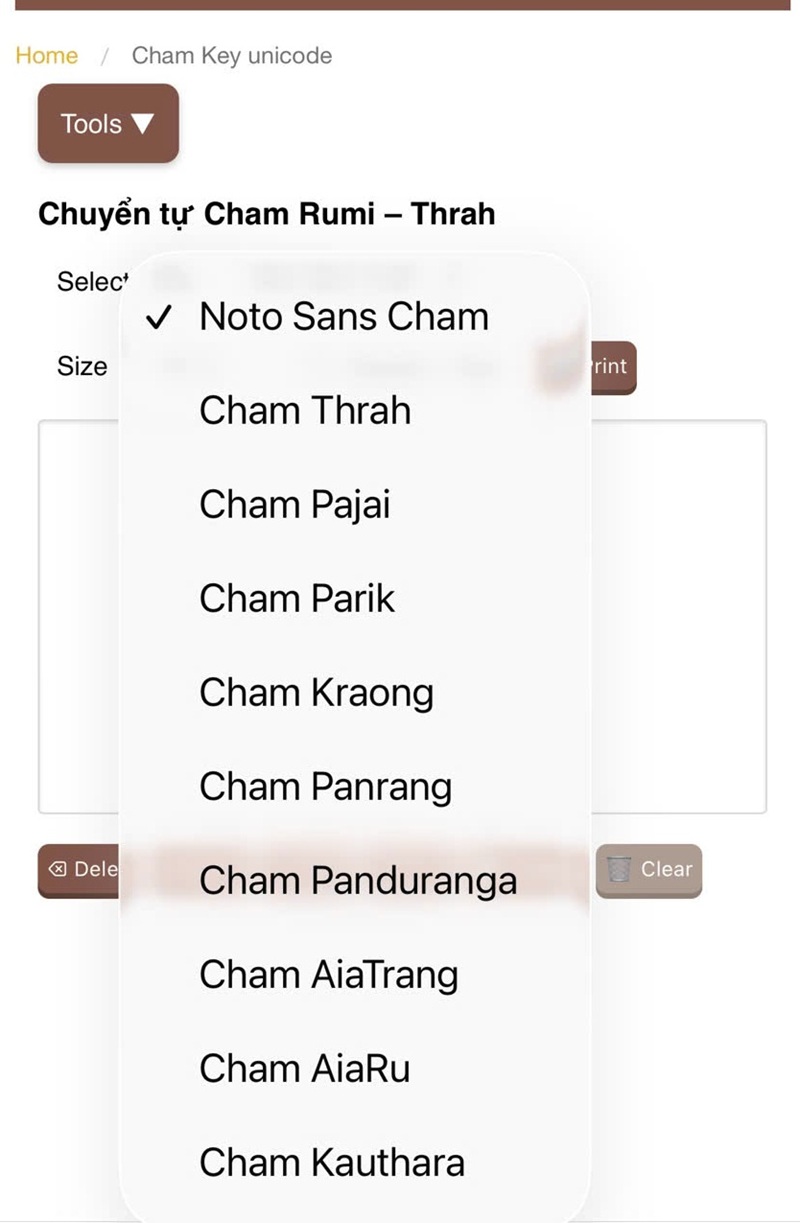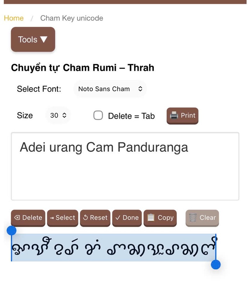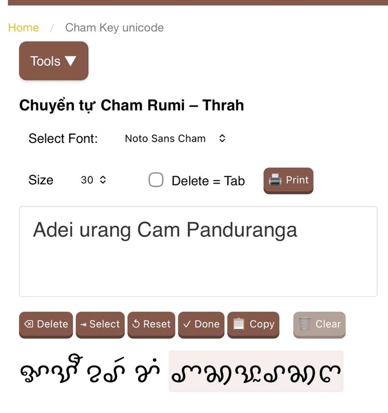 Đặc biệt, công cụ chuyển tự Rumi - Thrah giữ vai trò trung tâm trong hệ thống, cho phép chuyển đổi tự động giữa hai hệ chữ dựa trên nguyên tắc ngữ âm và chữ viết. Công cụ này giúp người dùng, ngay cả khi chưa thành thạo chữ Thrah, vẫn có thể tiếp cận, sử dụng và từng bước làm quen với hệ chữ truyền thống. Do đó, đây được xem là một giải pháp trung gian có ý nghĩa quan trọng trong tiến trình số hóa ngôn ngữ Cham.