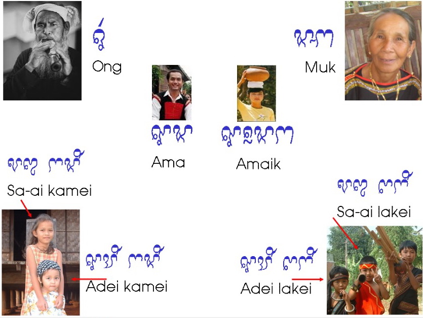 Po, dahlak hu pak adei saai. Saai lakei, saai kamei, dahlak saong adei kamei tra. Yes, I have 4 brothers and sisters. Elder brother, elder sister, me and younger sister. Dạ, em có 4 anh chị em. Anh trai, chị gái, em và em gái nữa. |